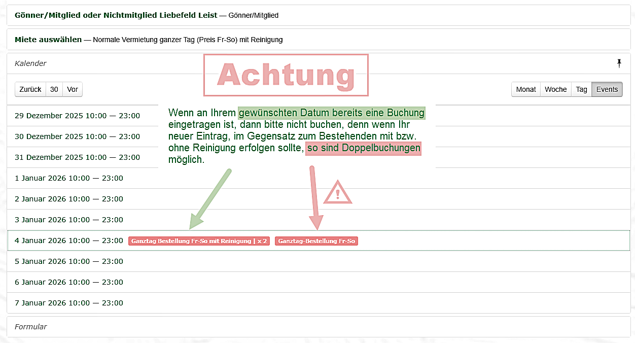 - Gewünschtes, noch freies Reservierungsdatum mit Zurück oder Vor im Kalender aufsuchen und anwählen. Beachten Sie jedoch bitte die angefügte Grafik um Doppelbuchungen zu vermeiden.