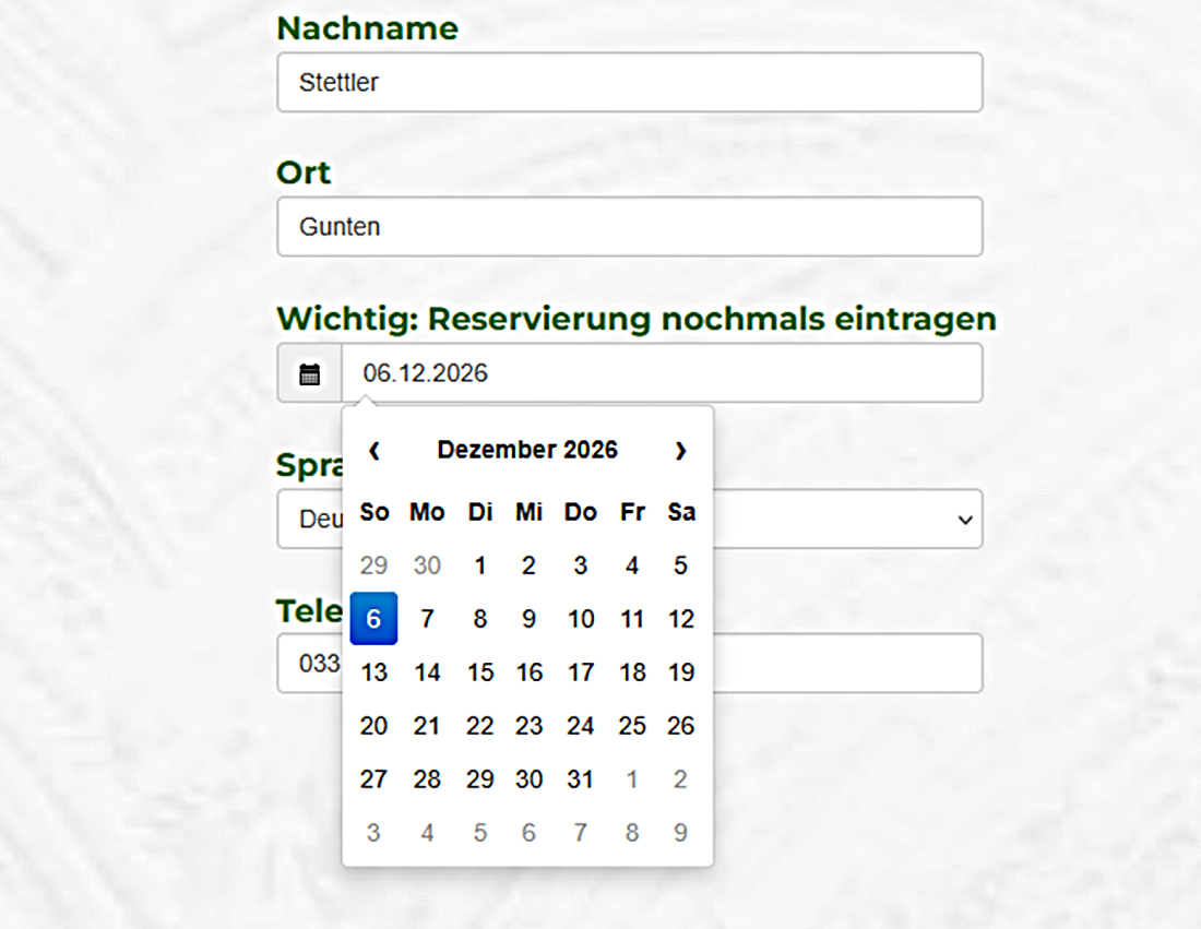 Das von Ihnen zur Bestätigung im Bestellformular nochmals eingegebene Datum, sollte mit dem von Ihnen im Kalender eingetragene Reservierungsdatum übereinstimmen, ansonsten besteht die Gefahr von Verwirrungen und damit ggf. Doppelbelegungen.